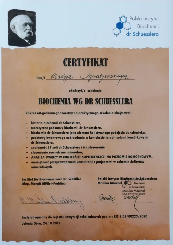 W swojej praktyce wykorzystuję również sole Schuesslera, grzyby lecznicze i homeopati, które wspierają procesy regeneracyjne i równowagę organizmu. Każdego klienta traktuje indywidualnie, dobierając terapię dostosowaną do jego potrzeb.